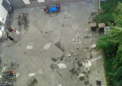 Komplettanlage von zwei Höfen mit Charlottenburger-Granit-Platten-Bruch und Mosaikpflaster.